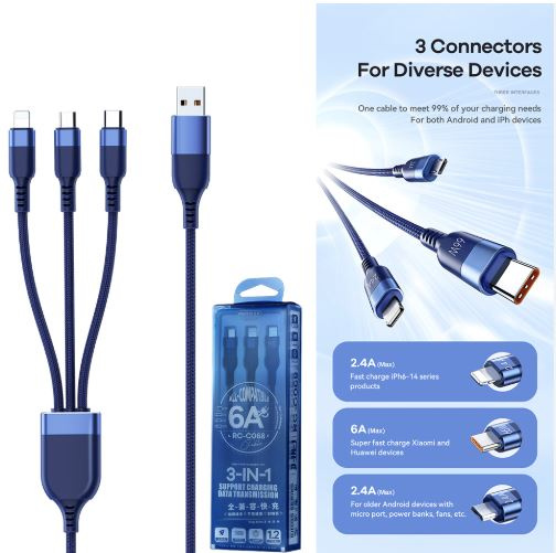 Cable Type: USB to Type-C, Lightning & Micro Data Cable | 3-in-1 Cable | 66W PD Super Fast Charge